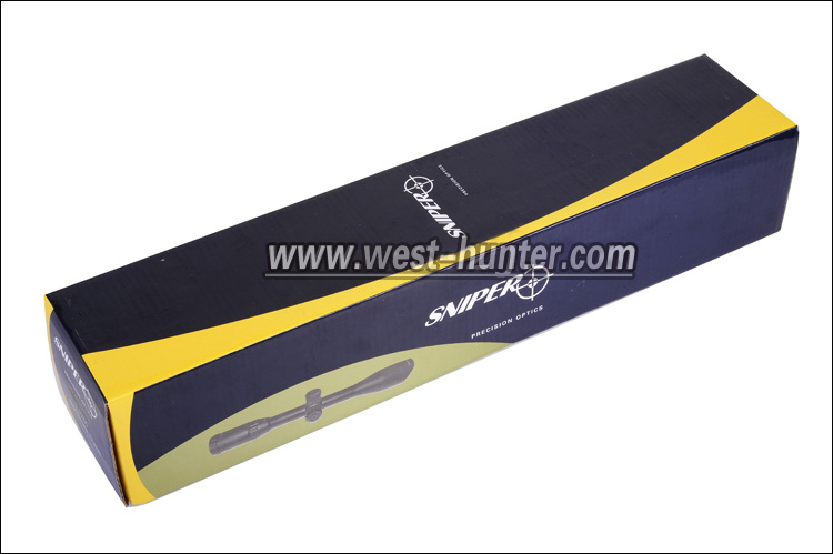 商品名称 SNIPER 狙击手 3-9x50斜口 密位分化瞄准镜 [放大倍率] 3-9 [重量] 470g [长度] 35cm [管径] 25.4 [物镜口径] 50mm [调节方式] 手调外调调节钮,TF2式锁定。(调节后按下去锁定 ,拔起来调节) [调节量] 1喀哒100码外1/4英寸 [分化线] 密位点 [分化材质] 玻璃丝 [镀膜方式] 宽带绿膜 [抗震与否] 是 [一体管与否] 是 [视度可调与否] 是 [充氮与否/防水防雾] 是