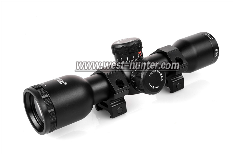商品名称 BSA TW4X30短款瞄 密点分化 放大倍率 4倍 重量 360g 长度 20.5cm 管径 25.4mm 物镜口径 30mm 调节方式 拉伸锁定式手调轮 调节量 100码外1咔哒1/4英寸 出瞳距离 10cm左右 分化线 密位点 分化材质 玻璃板 镀膜方式 宽带绿膜 抗震与否 是 一体管与否 是 视度可调与否 是 充氮与否/防水防雾 是