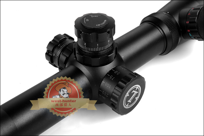 倍率:4-12倍(可任意切换)管径:30mm 物镜:40mm 调节方式:仿Leupold Mark 4高外露式调节钮 调节量:上下调节钮1喀哒100码外1/1英寸 左右调节钮1喀哒100码外1/2英寸 照明方式: 红光5档,绿光5档 一体管与否:是 物镜可调与否:否 侧调焦与否:是 视度可调与否:是 镀膜方式:宽带绿膜